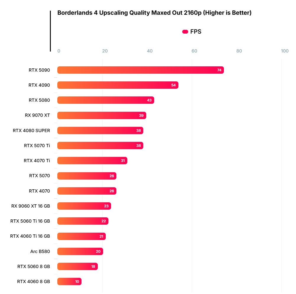 然后是开启AI拉伸测试。开启DLSS/FSR/XeSS后,《无主之地4》极度依赖拉伸技术才能达到能玩的帧数。然而,即使开启DLSS质量模式,RTX 5090也只能在4K画质下达到74FPS,RTX 4090只有54FPS。