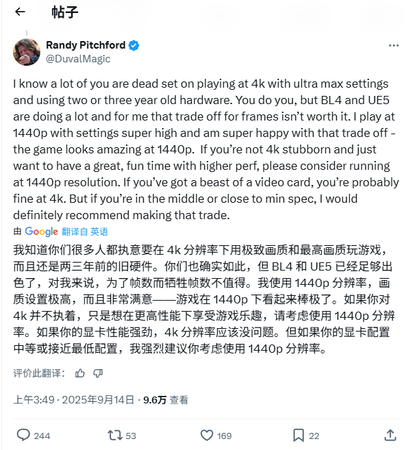 当被质疑过度依赖图像放大与性能优化时,Pitchford语气颇为强硬,甚至讽刺道,不满现有图像渲染方式的人可以尝试自己编写引擎。尽管言辞直接,他还是安抚玩家称,Gearbox正在积极监控遥测数据,以改进优化工具,并会持续提供不同PC配置下的性能调优指导。