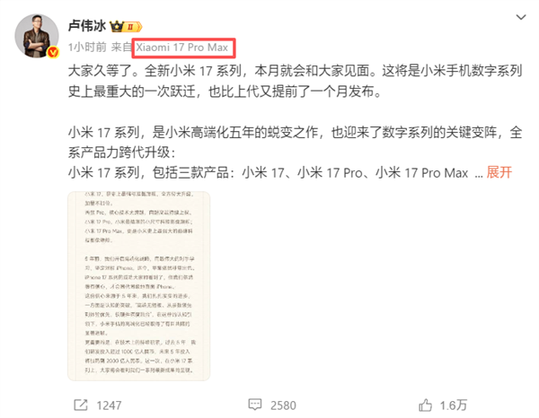 从卢伟冰发文就能看出端倪,他本人已经用上了小米17 Pro Max,这就意味着此次发布会就能登场。