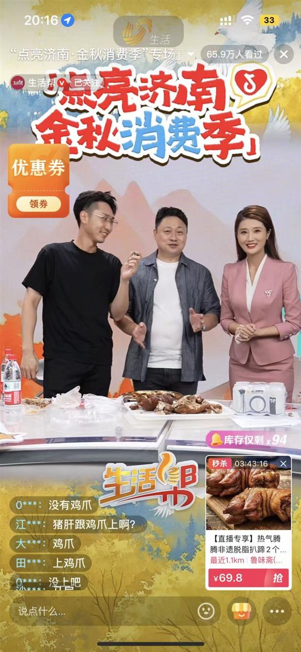 8月29日,“城市点亮计划”IP联合山东广播电视台“生活帮”栏目发起“点亮济南·金秋消费季” 专场直播活动。山东广播电视台三位主持人携手鲁味斋、徐升记等10家老字号与新锐餐饮品牌,推出历史低价团购套餐,吸引用户下单。中华老字号鲁味斋第三代传承人王剑辉等商家代表亲临直播间,讲述品牌故事、发放专属福利,吸引用户“线上抢券、到店消费” 。