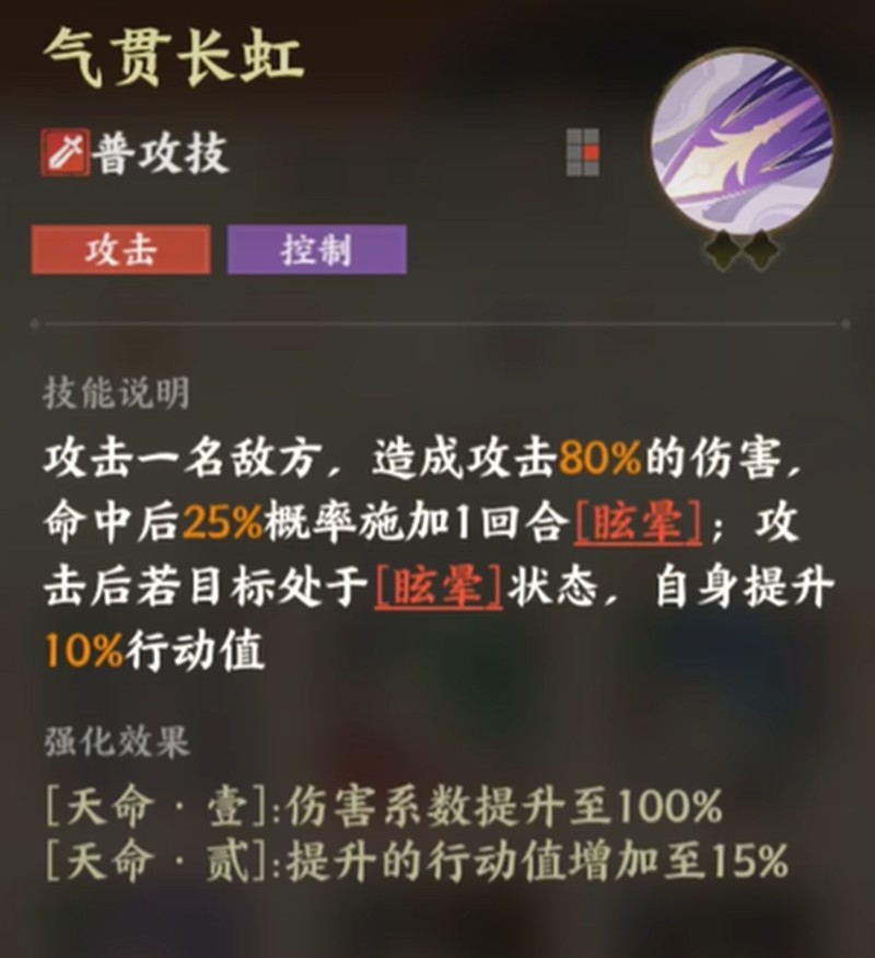 杨戬的普通攻击"气贯长虹"能造成80%攻击伤害,并有25%概率使目标陷入眩晕状态。当攻击眩晕目标时,杨戬可获得10%行动值提升。这个技能奠定了杨戬作为控制型输出的基础定位,配合暴击和命中属性的提升可以显著增强其控制效果。