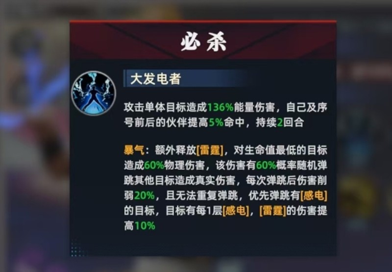 二阶堂红丸的必杀技是对单体目标造成强力打击,同时提升自身及相邻伙伴5%命中率,持续2回合。在爆气状态下,必杀技会额外释放雷霆之力,优先攻击生命值最低的目标,并有几率在带有感电效果的敌人间弹跳,形成连锁伤害。