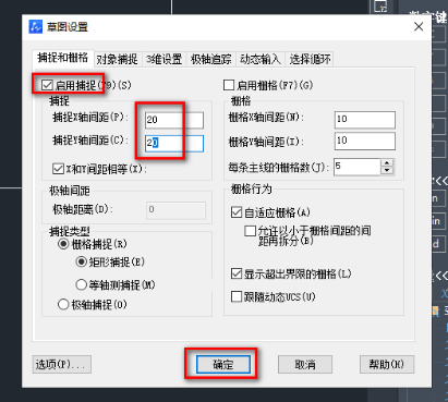 2、然后在打开的窗口界面中,点击上方中的"捕捉和栅格"选项卡,找到其中的"启用捕捉",将其小方框勾选上,并设置一个合适的间距数值,最后点击"确定"保存即可。