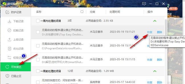 3、进入到新的窗口界面后,点击左侧栏中的"可恢复区"选项,然后找到右侧中需要恢复的选项,点击"恢复"按钮。