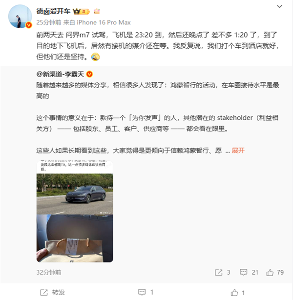 针对行程延误情况,服务同样到位。博主“德卤爱开车”乘坐 23:20 的航班且晚点至凌晨1:20抵达,华为的接机人员仍在等候,即便记者提议自行打车,工作人员也坚持提供接送服务。