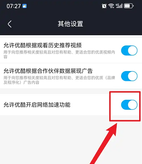 第三步:在其他设置界面,打开【允许优酷开启网络加速功能】右侧的开关。