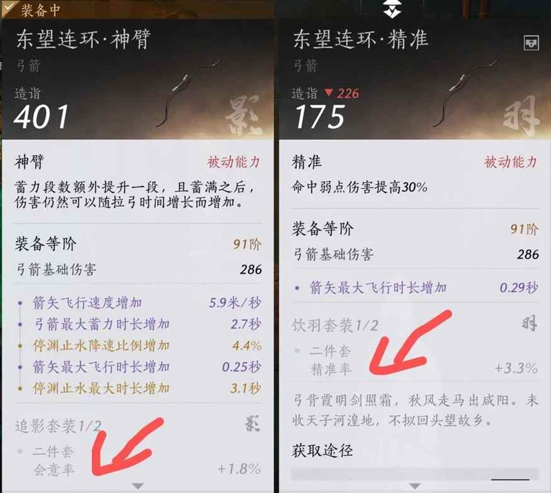 时间:2025-09-18 | 作者: | 阅读:01、金弓、玦:由于之前金弓、玦对于副本没有伤害提升,本次更新优化了金弓、玦增加套装效果,主要分为精准率、会意率、会心率三种,根据主播的理解,剑类的流派需要制作追影套(+1.8%会意),其他流派就需要制作会心套了(主播还没做出来这个金弓,没有截图,有做出来的可以发一下),饮羽套(3.3%精准)作为通用流派使用。另外本次增加金弓金玦的保底机制,好像50次就可以做出大保底了,不要再担心做不出金弓玦了,另外要注意的是也不能随便做金弓、玦了,不仅要做出来,还得做出套装的,不然套装无法生效。