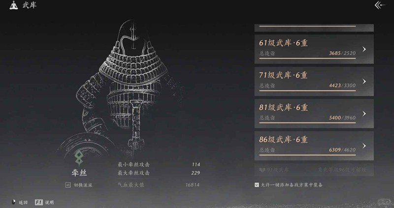 4、武库:主播上期说到新赛季更新后会增加86级武库,所以需要把每件86级的装备都调成全金的再放入武库,这样可以最大提升武库的气血加成值,主播最终的气血最大值1.6814,角色气血最大值11.5W的样子,新副本白狼主血雾机制血不够很容易暴毙,这个时候武库的提升就很重要了。