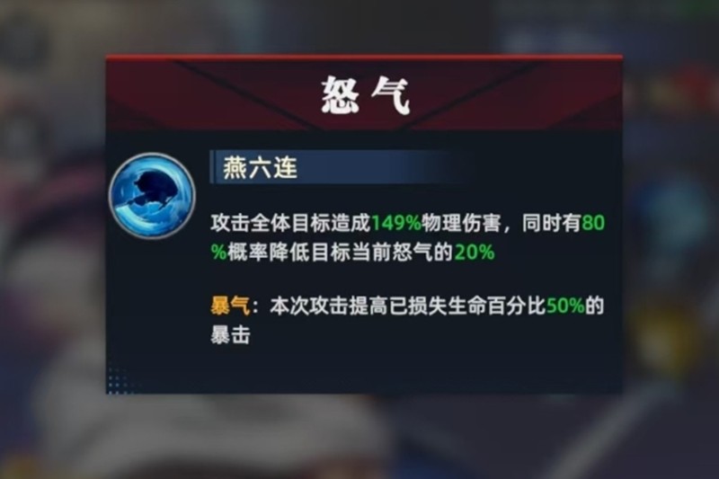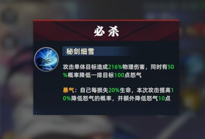 橘右京的怒气技能"细雪"能攻击全体敌人,80%概率降低目标当前20%怒气。在爆气状态下,该技能会根据损失生命值的50%提升暴击率。当生命值低于50%时,爆气状态还能提供15%暴击率和15%命中率加成,持续两回合。这使得橘右京在残血时反而能爆发出更强的战斗力。