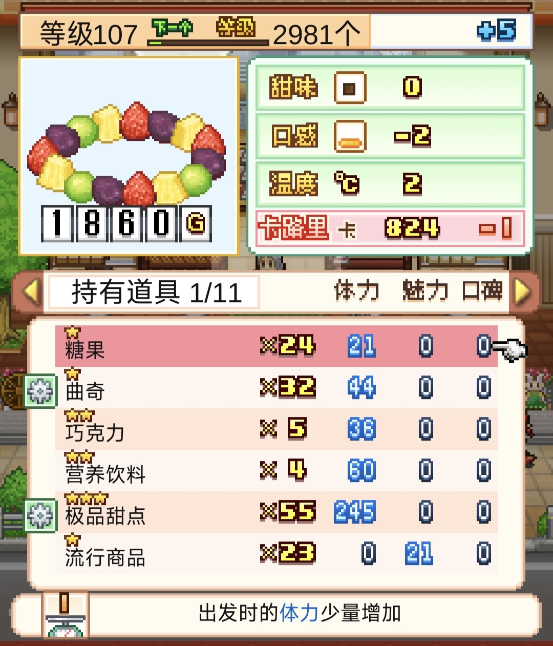 第7产地5级制作(口感+2,甜味-2),第11产地2级比赛,李耕夫收尾。打泡鲜奶调整为甜味-5,口感+11,卡路里用过道具减少。