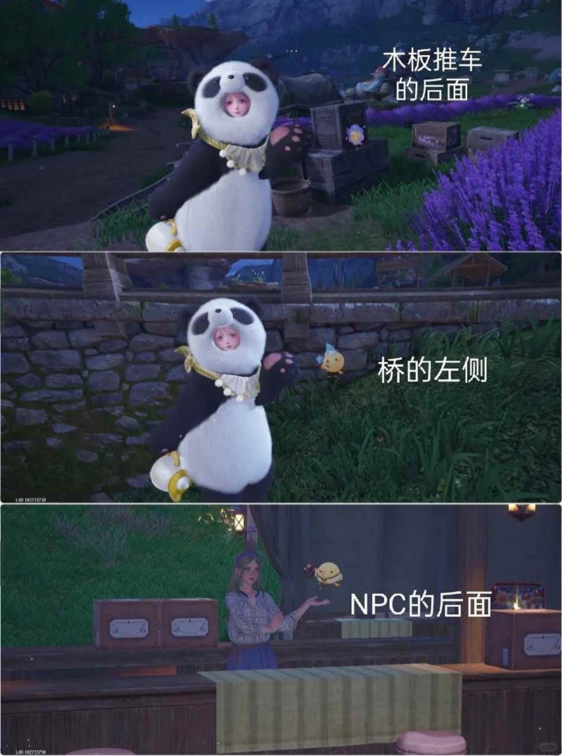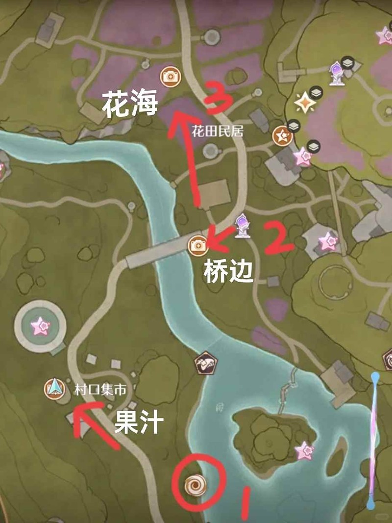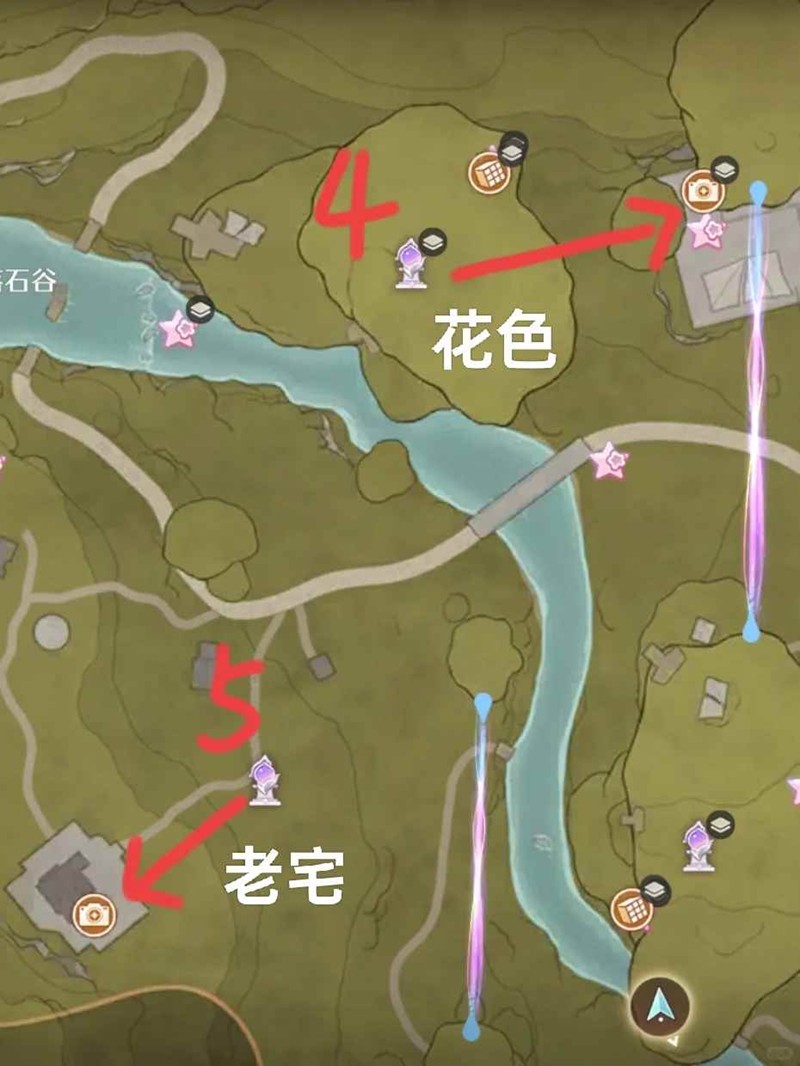 2、传送到村居岔路,往标的方向走,到标相机的位置后会看到在桥的左侧