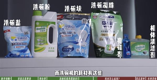 耗材成本是长期使用的重要考量,选择合适的耗材既能保证清洁效果,又能节省开支。需特别注意:所有机型均需使用专用洗碗机耗材,误用洗洁精会导致泡沫溢出,损坏机器。在耗材类型上,洗碗粉是性价比之选,清洁效果不输洗碗块与凝珠,且单次用量可根据油污程度灵活调整;软水盐建议选择国产通用款,成分均为氯化钠,无技术差异,单次使用成本仅约4毛,一年总开支约140多元;漂洗剂与机体清洁剂则属于非刚需,若机型本身烘干效果好、自带自清洁或高温冲洗程序,可直接省去这部分开支。此外,网友常见的“平替方案”如小苏打、白醋代替漂洗剂,“清皂母”代替洗碗粉等,未来有可能对这些方案的效果进行测评。