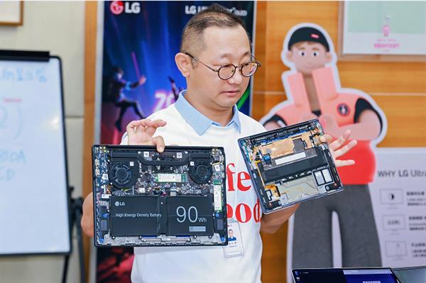在接下来的LG gram轻薄笔记本分享交流环节,R&D 研发负责人借助LG笔记本零配件拆解方式,通过现场铝合金和镁铝合金坚固度弯曲测试、笔记本重量猜猜猜,内部散热设计差异对比等多样的展示方式,让同学们了解到了LG gram轻薄工艺的苛求、对于轻薄背后可靠性的深度探索,以及对于LG gram简约美学设计理念。
