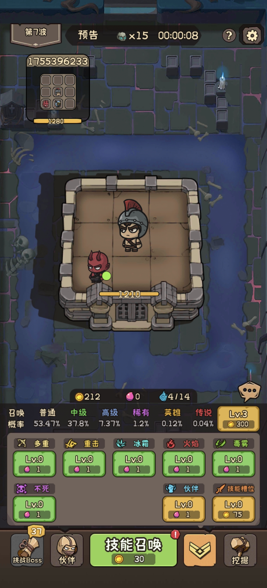 抽卡比较非,只有恶魔一个伙伴,技能也只解锁到橙色,但目前是完全够用的。