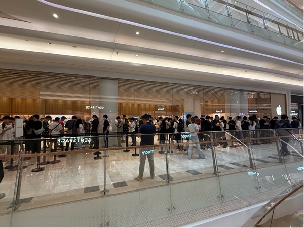 深圳宝安壹方城苹果直营店刚刚营业约20分钟,店内就已人头攒动,现场取货队伍亦排起长龙。