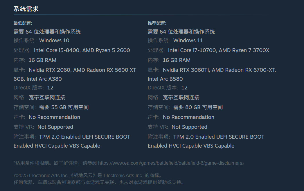 《战地6》Steam商店页公开的PC配置确认该作至少需要80GB硬盘安装空间,但如果是允许玩家自由安装,至少能让玩家节省不少SSD空间。