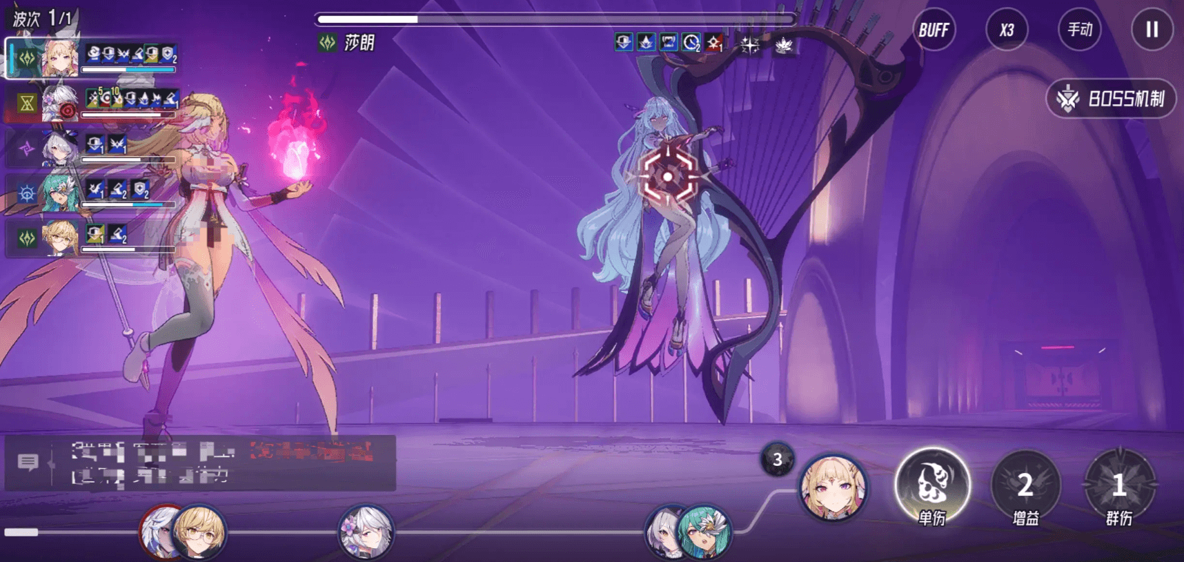 莎朗是我们爬塔中会遇到的难度boss,她总共有3个阶段,第1阶段我们通过酣梦的“睡眠花苞”,以及芙蕾雅的技能二来抵抗住持续伤害,同时去压莎朗的血线,等压到还有一丝血的时候,让凌罗开大附加免疫效果,然后下一位角色平a收掉进入2阶段;在2阶段花骨朵会随机选择两位角色来附加标记,当被标记者行动时,花骨朵若没有处于不可行动状态,会眩晕一位并立刻行动一次;