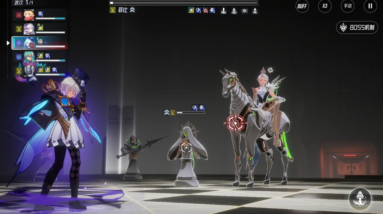 菲比安虽然也难,但可以依靠逃课打法来快速通过,这里带恶命就能直接逃课,带卡奇主要是为了防止嘲讽没中的情况,此时可以用他的二技能拉回来,注意这个打法的要点一,就是梨梨的双生戏法一定要给恶命,务必要嘲讽住哪怕打的慢点也没有关于,要点二就是要先把左右两个棋子给打掉,然后再打掉一个棋子,最后一个一定不要打死,慢慢把boss给磨死就可以了。