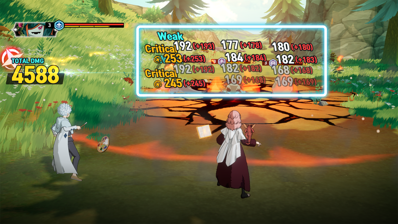 使用「攻击技能」后,根据持有的「增益效果」和立即生效的「增益效果」而增加的伤害量会显示在红色括号内。