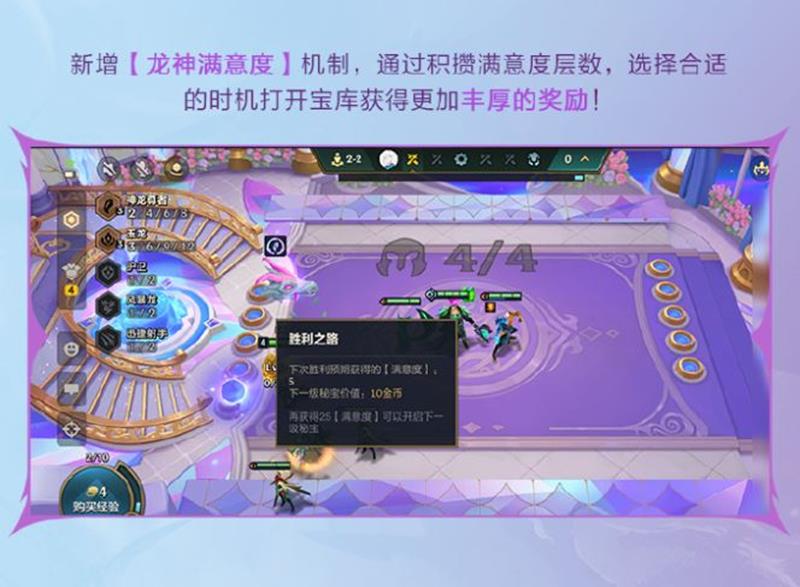 例如,新增了龙神羁绊,龙神试炼机制也进行了优化,弈士可以通过积攒满意度层数,选择合适的时机打开宝库获得丰富的奖励。此外,新赛季还带来了全新的小小英雄和优化后的技巧加成系统,让弈士们在对局中获得更好的体验。
