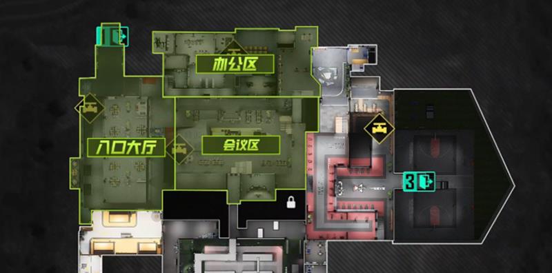 地图设有西北、东南和中央偏下三个撤离点。玩家可以根据出生位置选择不同进攻路线。常见路线是从入口大厅直取会议区保险箱,随后攻占办公区总裁室,最后向西北撤离点推进。另一条稳妥路线则是经战术区收集镭钻补给后,转战健身餐饮区,最终从东南方向撤离。