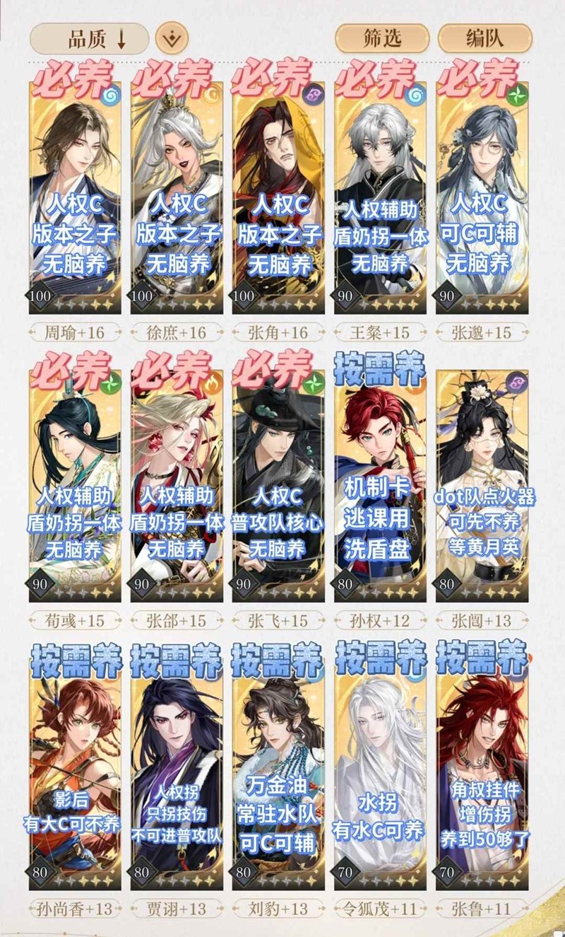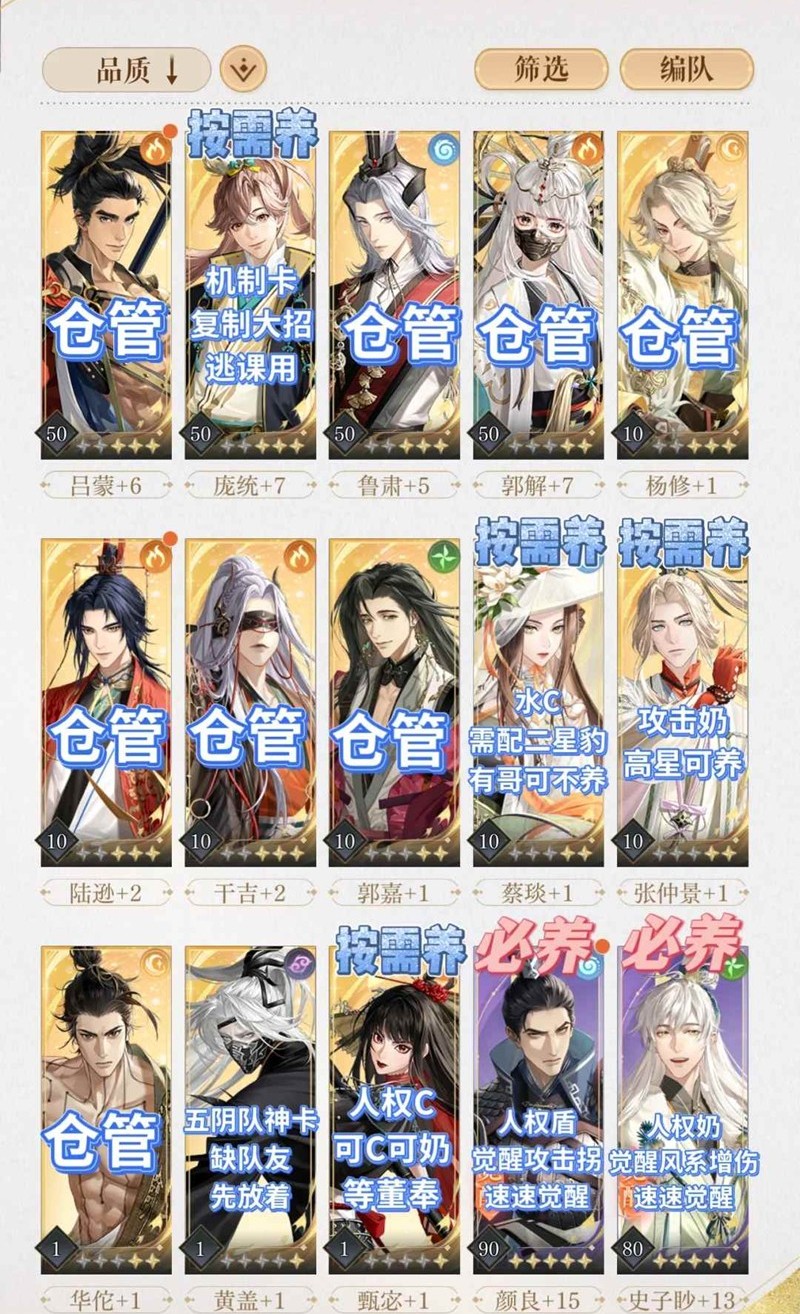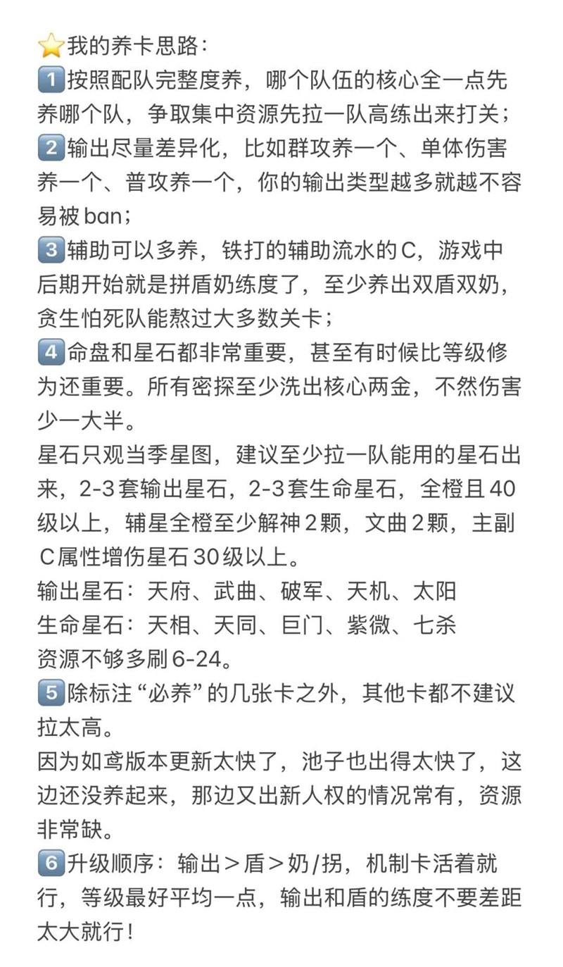 按需养的卡:确定有队友/卡关再养,练度活着就行(常用的养到70,其他的站不住再升)