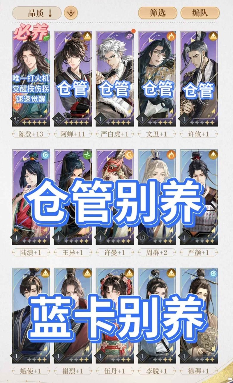 新手有啥用啥,实在抽不到卡用仓管过渡也行,但蓝卡不要养,紫卡别乱养。