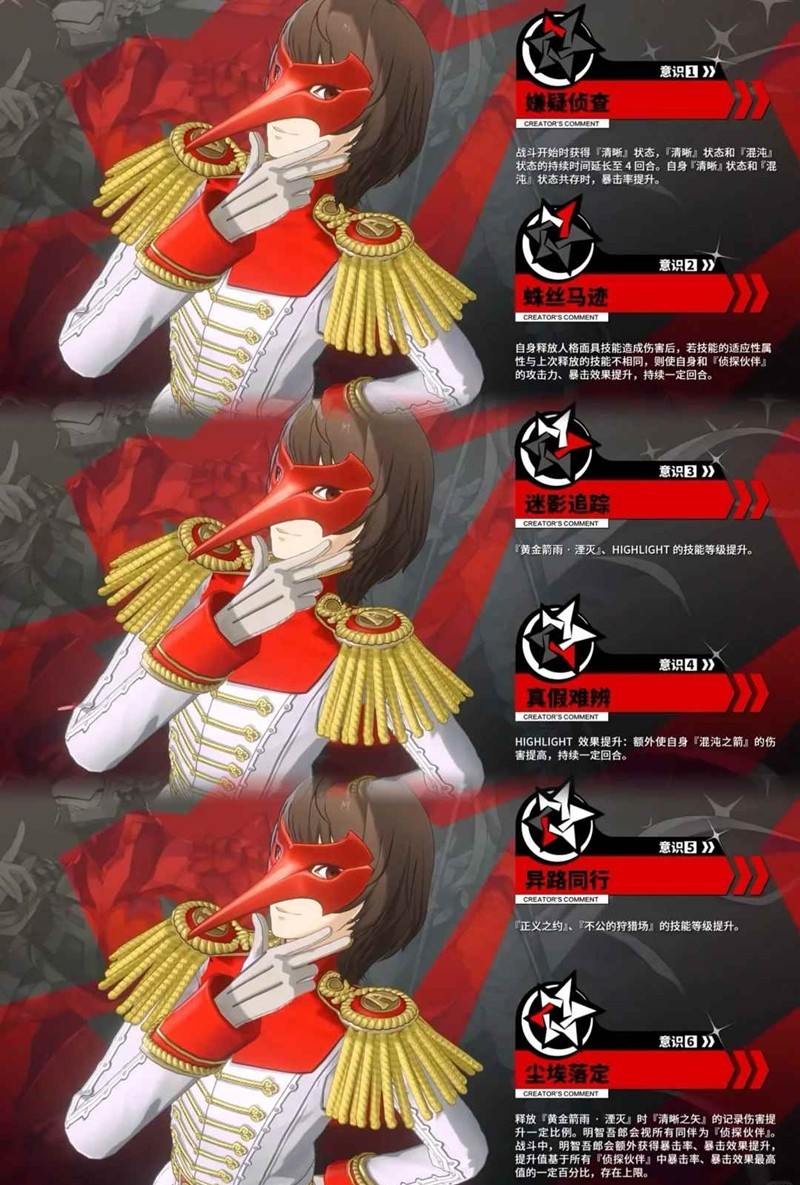 意识提升:1意识清晰混沌从两回合延长至四回合,同时存在时提升松饼暴击率;2意识自身释放不同属性技能则和同伴增加攻击和暴伤;3意识三技能和HL等级提升;4意识H L和“混沌之箭”伤害提升;5意识一二技能等级提升;6意识质变,视所有同伴为侦探伙伴。