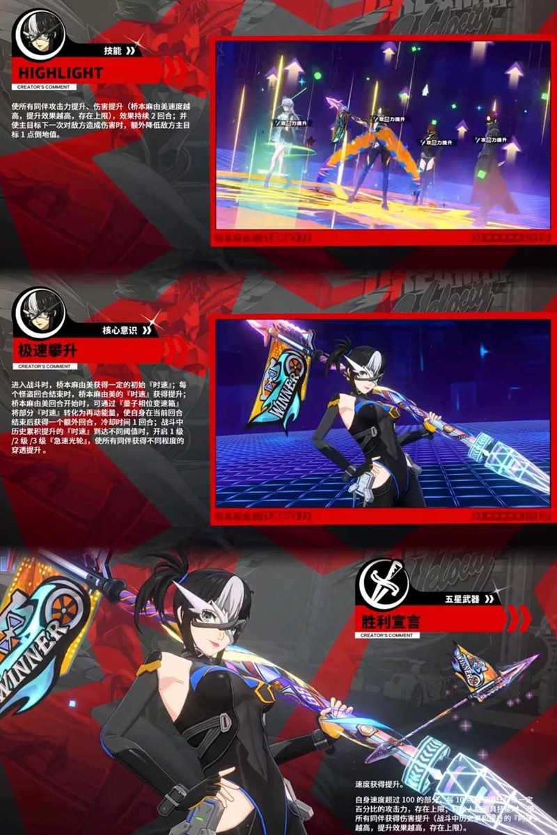 专武:增加速度,提升自己的攻击,使队友获得增伤(此增伤视历史累计时速来定,累计越多加成越高,有上限)