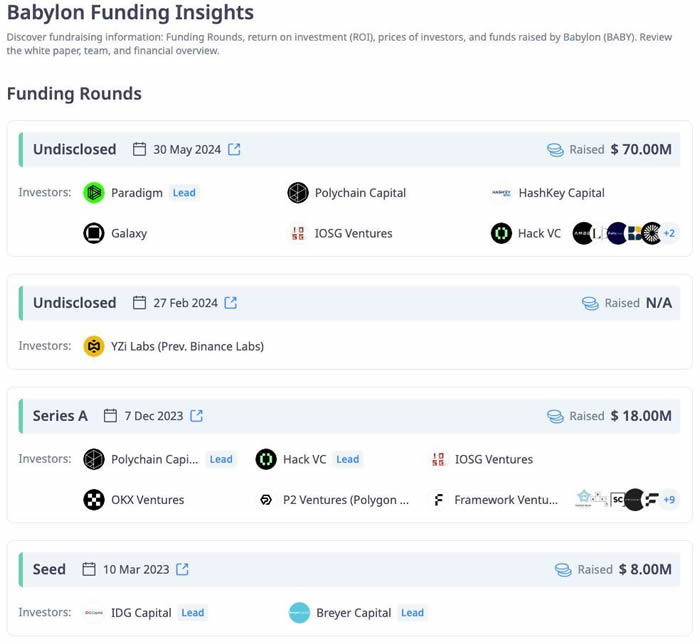 – 顶级风投机构:Paradigm、Polychain、Bullish、Binance Labs 领投了Babylon 在2024 年的7000 万美元融资。