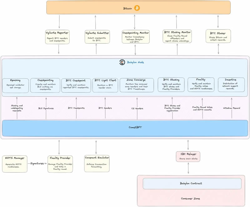 – Babylon 链协调(Babylon Chain Coordination):中继者(Relayers)将BTC 质押交易信息传递给Babylon 链,使质押的BTC 关联到验证者和最终确认提供者(FPs)。