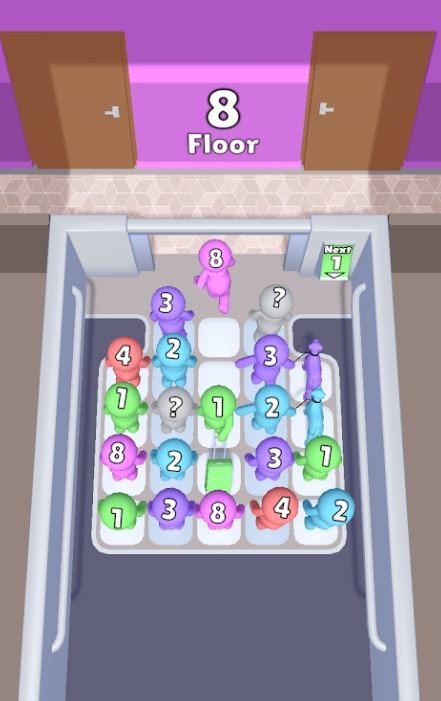 除了这种玩法之外,在游戏里还会设定电梯内场景,在这里每一个角色都会有自己想去的楼层,大家要在到达相应的楼层之前,快速去移动这些角色的位置,这样才能在到达楼层之后,让角色离开电梯,有了这种顺序的调整也能避免电梯的拥堵,可以节省更多的时间,游戏相对比较简单好操作,通过单个手指就可以控制这些角色,所以说后期挑战会设定不同的目标,整体的难度也会变得更大一些,比如在电梯运行的过程中,就会变得更快,另外也会限制运输人数,能增加关卡的挑战性。