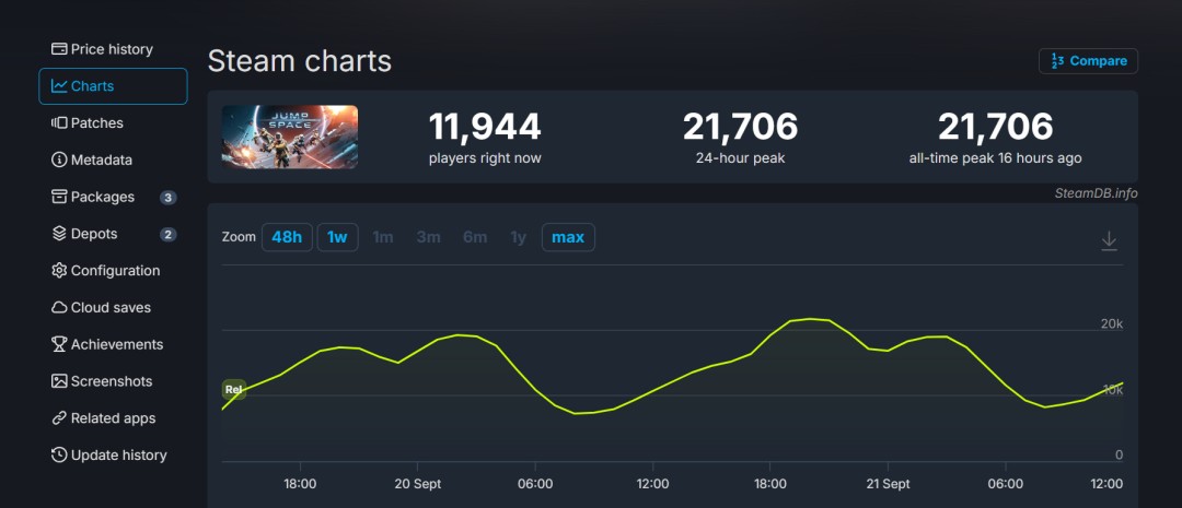 SteamDB显示《Jump Space》在解锁发售16个小时后,同时在线峰值打斗21706人,当前在线11944人。虽然玩家人数不及《空洞骑士:丝之歌》或《无主之地4》那样的数十万,但早期用户的评价还是相当不错的。