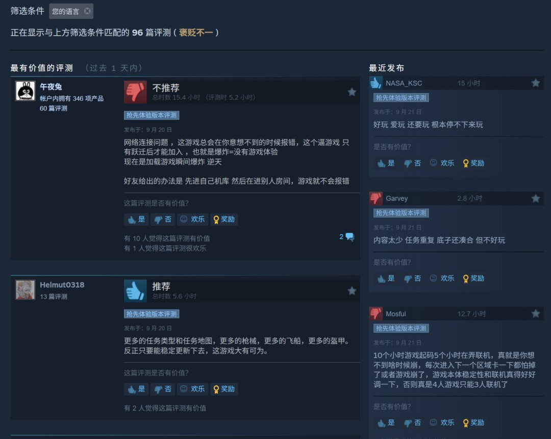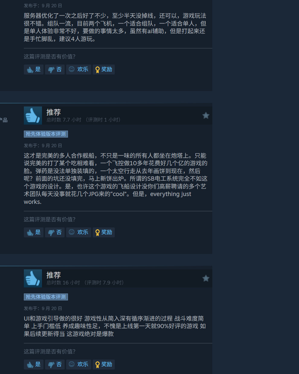 Steam上其中一个最热门评论写道:“一开始的印象非常好,游戏优化一流……你会跟着飞船在太空中跳跃。10/10。会再跳一次。”