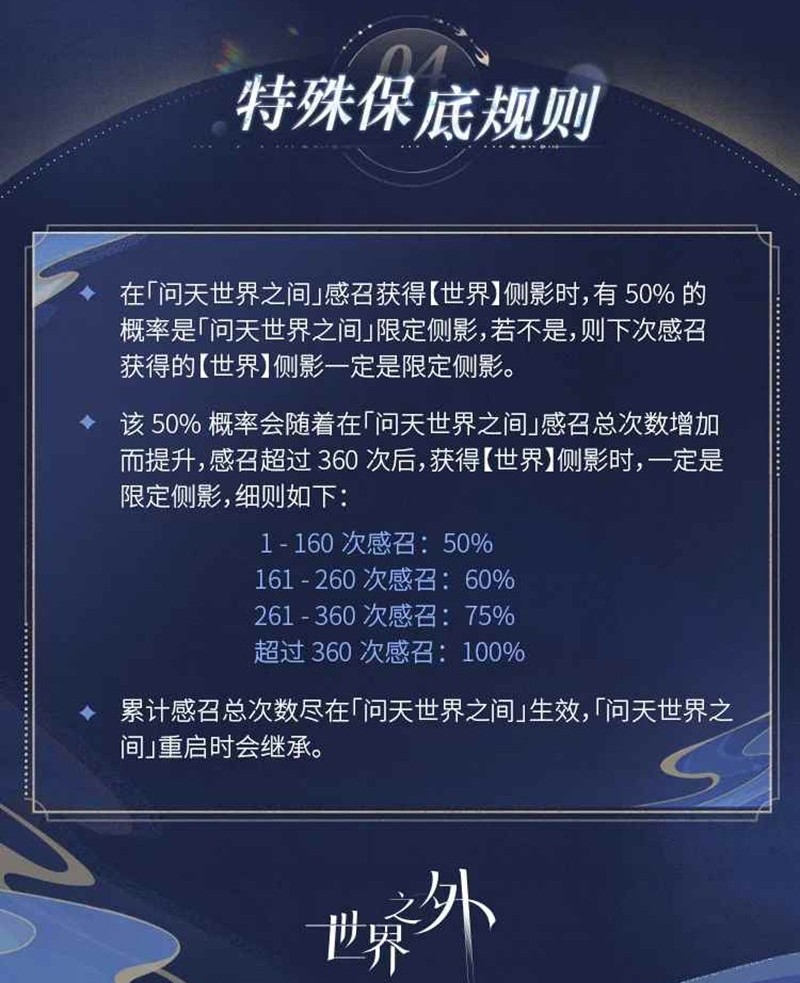 ?在「问天世界之间」感召获得【世界】侧影时,有50%概率是「问天」限定侧影,若不是,则下次感召获得的【世界】侧影一定是「问天」限定侧影。