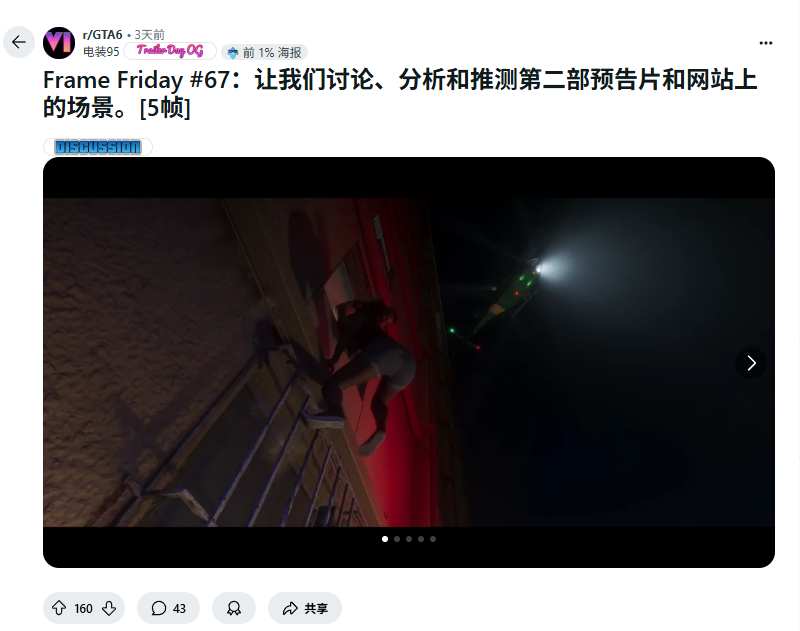 时间:2025-09-22 | 作者: | 阅读:0距离《GTA6》正式发售还有数月时间,但玩家社区的热情丝毫未减。据悉,Reddit 用户 u/Denso95 已连续 67 周发起“帧画星期五”(Frame Friday)活动,对预告片逐帧进行分析和讨论,该传统已坚持了约 15 个月。