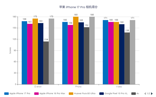 在DXO影像第六版基准测试下,iPhone 17 Pro获得168分,位列全球影像排行榜第三。