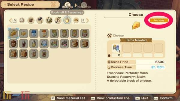 在加工台制作界面中,流行商品的右上角会显示「流行图标」(↑箭头或特殊标记),方便快速识别需优先制作的商品。