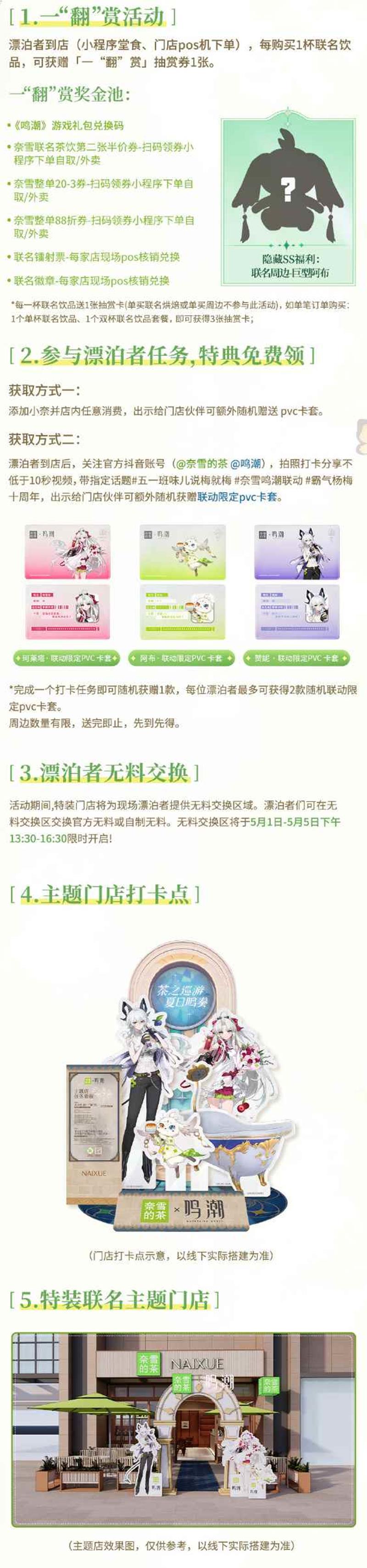 漂泊者到店通过小程序堂食或门店pos机下单购买联名饮品,可获赠“一‘翻’赏”抽奖券,有机会抽取《鸣潮》游戏礼包兑换码、奈雪各类优惠券及联名镭射票、徽章等。如在特装门店购买1个单杯联名饮品、1个双杯联名饮品套餐,可获3张抽奖卡。此外,添加小奈店内任意消费,或关注官方抖音账号带指定话题打卡分享视频,可随机获赠联动限定PVC卡套,每人最多获2款。5月1日至5日,特装门店下午13:30至16:30还开放无料交换区。