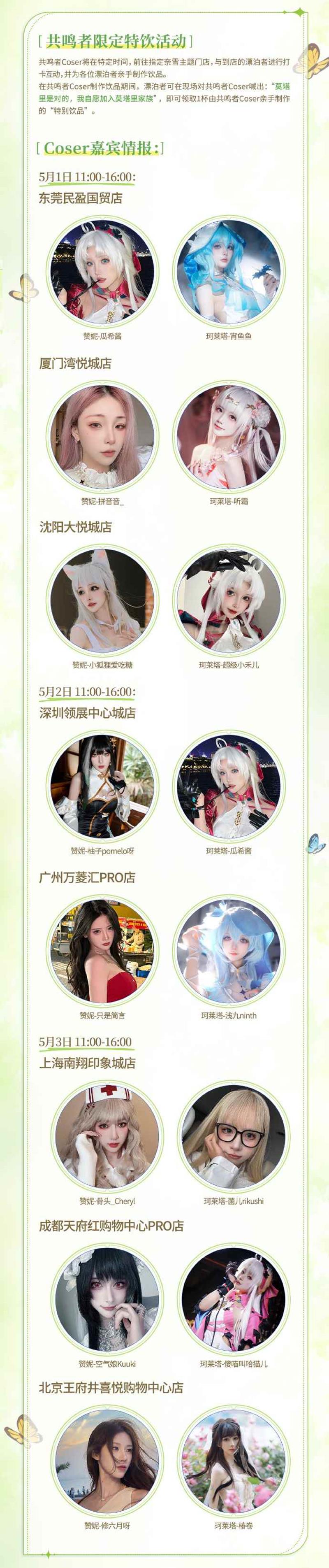 活动期间,特装门店设打卡点,漂泊者可实地感受《鸣潮》与奈雪的茶联名氛围。部分门店特定时间有共鸣者Coser互动,如5月1日东莞民盈国贸店有赞妮·瓜希酱、珂莱塔·宵鱼鱼,厦门湾悦城店有赞妮·拼音音_、珂莱塔·听霜等,现场喊指定口号可领特别饮品。