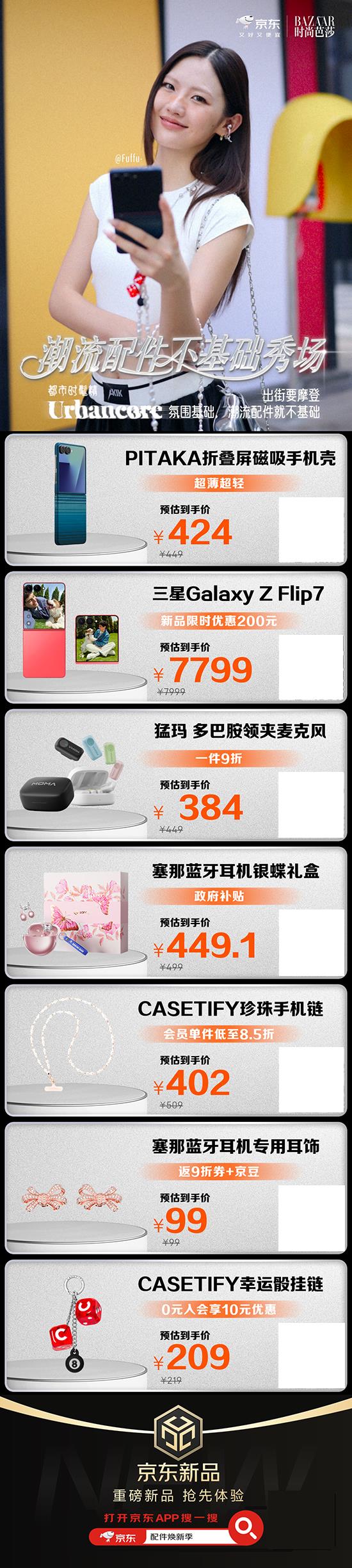 打破科技产品使用边界,将数码配件完美融入日常造型。三星Galaxy Z Flip7凭借折叠设计与时髦配色,成为出街穿搭的时尚单品,京东限时优惠200元,到手价7799元;猛玛多巴胺领夹麦克风以明快配色与小巧形态,兼顾功能与时尚表达,京东一件9折,仅384元;SANAG塞那S6银蝶礼盒以金属银与蝶翼元素打造视觉焦点,国补后449元,彰显前卫与优雅并存的美学风格。