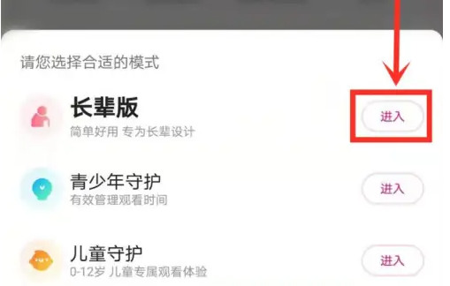 打开优酷视频app,点击右下角【我的】,点击页面左上角【模式切换】,选择合适的模式,点击右侧【进入】,点击底部【开启】即可。