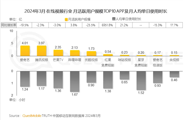 根据QuestMobile发布的2024年3月在线视频行业月活跃用户规模数据,排名前十的APP中,爱奇艺和腾讯视频的月活用户均达到了4亿级别。