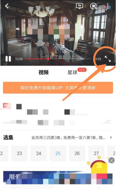第三步:手指触摸下正在播放的视频界面,视频播放区域右下角会弹出两个相对的箭头,点击它们就可以进入全屏观看了。