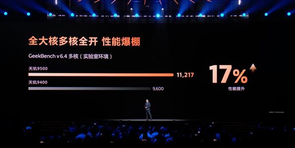如此强悍的算力,更需要更快的闪存架构。天玑9500率先支持全新四通道 UFS 4.1,从行业主流的双通道倍增到四通道,读写性能翻倍,大模型载入速度提升40%。强悍旗舰芯配置加持,天玑9500单核性能较上一代提升高达32%,多核性能提升17%,综合性能表现稳居行业第一梯队。即便对比苹果最新的旗舰芯片,天玑9500同样能做到单核不输、多核大赢。