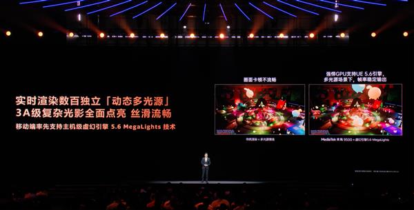生态为王,赋能主机级画质。天玑9500率先成为首款支持虚幻引擎5.5 Nanite技术和5.6 MegaLights技术的旗舰芯片。Nanite技术让其三角物体渲染能力暴涨十数倍,可实时渲染千万量级的几何模型;MegaLights技术则将手游光源渲染数量从数个提升至数百个。
