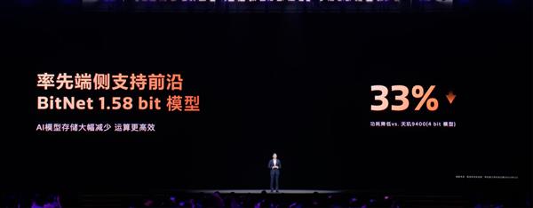 前沿技术,更快更省电。全新升级的生成式AI引擎2.0,面向Transformer和大模型运算提供专用固化电路,让端侧AI运行更快、带宽更省,功耗更低更省电。此外,天玑9500还率先支持BitNet 1.58 bit框架,相比4bit模型功耗再降33%。