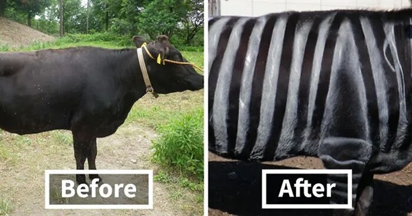 研究团队的负责人是小岛知树(Tomoki Kojima),他们进行了一项古怪的实验,将颜料涂在牛身上,模拟出斑马的条纹,目的是研究这种条纹防蚊虫的效果。