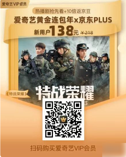 1、新用户138元一年,爱奇艺黄金会员+京东PLUS,原件218,节省80元。