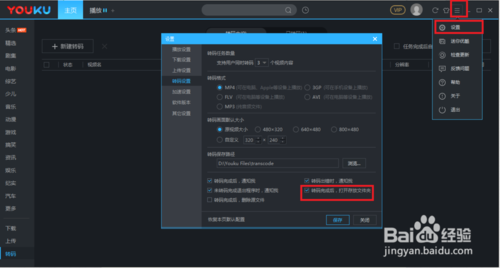 首先打开优酷,点击右上角的:三字样的菜单选项——选择设置——点击转码设置,主要设置一下同时转码的数量,转码画面默认大小以及保存路径——最后保存设置。